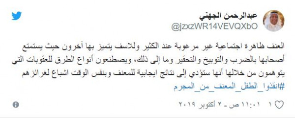 وانتقد "عبدالرحمن الجهني" ظاهرة العنف: "العنف ظاهرة اجتماعية غير مرغوبة عند الكثير وللاسف يتميز بها آخرون حيث يستمتع أصحابها بالضرب والتوبيخ والتحقير وما إلى ذلك، ويصطنعون أنواع الطرق للعقوبات التي يتوهمون من خلالها أنها ستؤدي إلى نتائج ايجابية للمعنف وبنفس الوقت اشباع لغرائزهم".