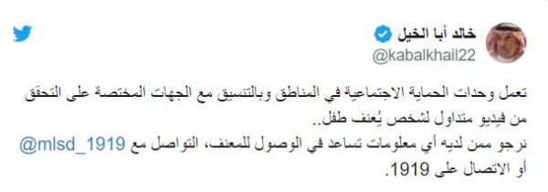 وقال في تغريدة عبر "تويتر": "تعمل وحدات الحماية الاجتماعية في المناطق وبالتنسيق مع الجهات المختصة على التحقق من فيديو متداول لشخص يُعنف طفلا".