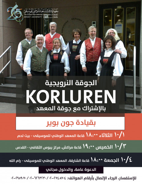 ينظم معهد ادوارد سعيد الوطني للموسيقى، حفلا غنائيا بالشراكة ما بين للجوقة النرويجية Korluren وجوقة معهد إدوارد سعيد الوطني للموسيقى، وذلك في الفترة من 1 أكتوبر وحتى 4 أكتوبر في القدس ورام الله وبيت لحم.