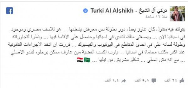 وكتب آل الشيخ عبر صفحته الشخصية بموقع التواصل الاجتماعي "فيسبوك": "يقولك فيه مقاول كان عاوز يعمل دور بطولة بس معرفش يشطبها … هو للأسف مصري وموجود في إسبانيا الآن".