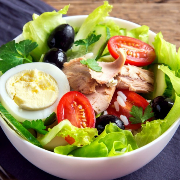 في وعاء ثانٍ، ضعي الخسّ، الخيار، البصل، الطماطم، الزيتون والتونة.