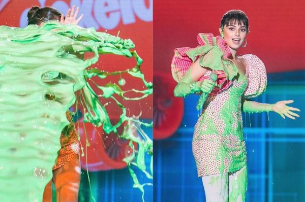 واثناء إلقائها التحية النهائية فوجئت بشلال من سائل أخضر ينفجر أمامها مبللاً جزءًا من ملابسها قبل أن تسارع إلى الهروب إلى الخلف.