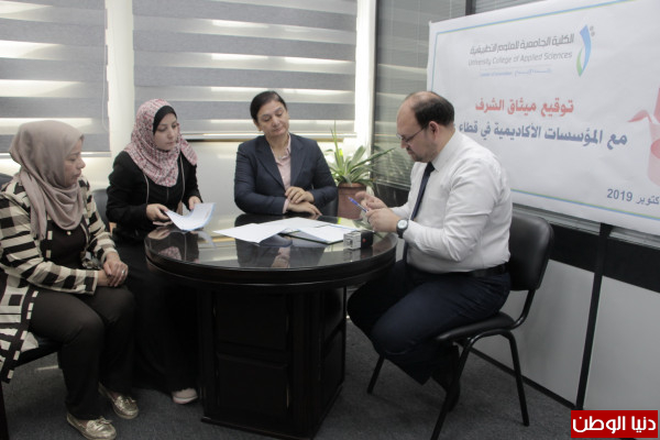 وقعت الكلية الجامعية للعلوم التطبيقية ميثاق شرف مع مركز الإعلام المجتمعي لحماية وتعزيز حقوق المرأة في المؤسسات الأكاديمية، وذلك بحضور ومشاركة كل من الدكتور أحمد الدحدوح نائب الرئيس للشئون الأكاديمية، السيدة عندليب عدوان مدير المركز، السيدة حنان صيام عضو مجلس الإدارة، السيدة نوار العشي منسقة مشروع سفراء من أجل حقوق المرأة.