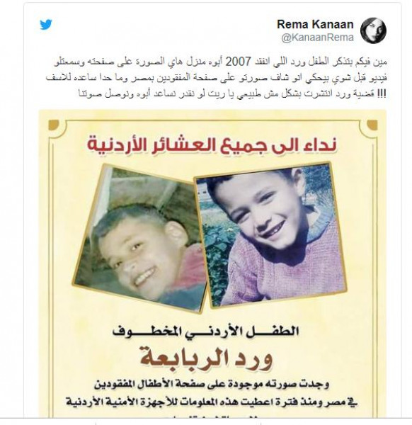 عادت قضية الطفل الأردني الذي اختفى في ظروف غامضة عام 2007 إلى الواجهة، بعد أن غردت ناشطة أردنية على تويتر "مين فيكم بتذكر الطفل ورد اللي انفقد 2007 أبوه منزل هاي الصورة على صفحته وسمعتلو فيديو قبلشوي بيحكي انو شاف صورتو على صفحة المفقودين بمصر وما حدا ساعده للأسف !!! قضية ورد انتشرت بشكل مش طبيعي يا ريت لو نقدر نساعد أبوه ونوصل صوتن".