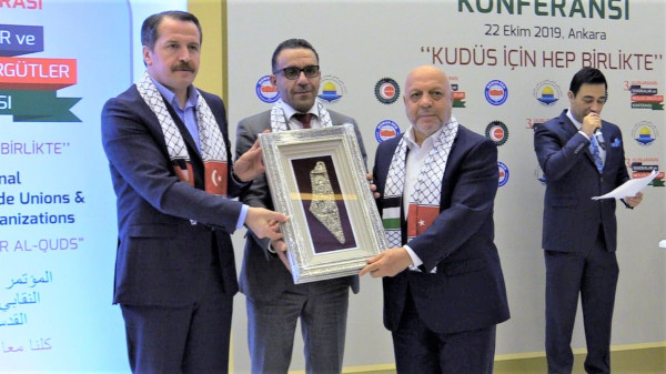وكان الائتلاف النقابي العمالي لدعم القدس وفلسطين قد أكد في ختام أعمال مؤتمره الثالث الذي عقد في العاصمة التركية انقرة مساء الثلاثاء وبحضور ومشاركة اكثر من 700 شخصية اعتبارية ممثلة 46 دولة في مقدمتها فلسطين حيث كانت مشاركة غيث لافته، إضافة إلى السفير مصطفى، ومشاركة نقابات تركية عديدة، إلى جانب شخصيات وبرلمانيين أتراك وعرب بارزين، في مقدمتهم وكيل رئيس حزب العدالة والتنمية التركي نعمان قورتولموش، وياووز سليم قران، مساعد وزير الخارجية ، اعرب عن مواصلة تضامنه مع الشعب الفلسطيني إلى حين تأسيس الدولة الفلسطينية الحرة المستقلة كاملة السيادة وعاصمتها القدس، ودعم مسيرات العودة الكبرى السلمية، حتى تحقيق كامل أهدافها بعودة كل فلسطيني إلى دياره.