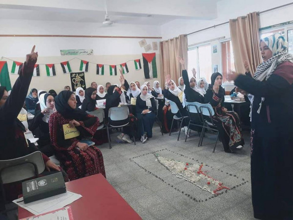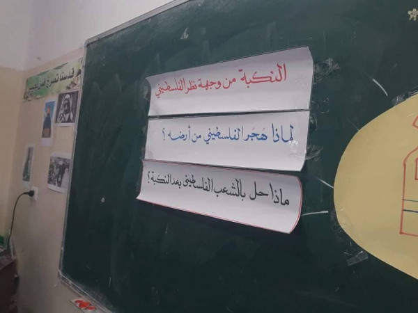 كما اعتمدت المعلمة على توظيف التعلم التعاوني و تكليف كل طالبة قائد كسفير عن مجموعتها، واختتم الدرس بأنشودة معبرة عن معاناة الأهل بعد النكبة وغلق الدرس من خلال استراتيجية بطاقة خروج.