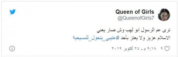 وعلقت مغردة تسمي نفسها "كوين أوف جيرلز": "ترى عم الرسول ابو لهب وش صار يعني الاسلام عزيز ولا يعتز بآحد #عتيبي_يتحول_للمسيحية".