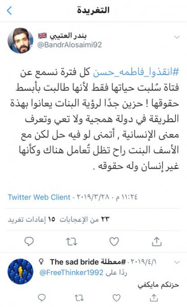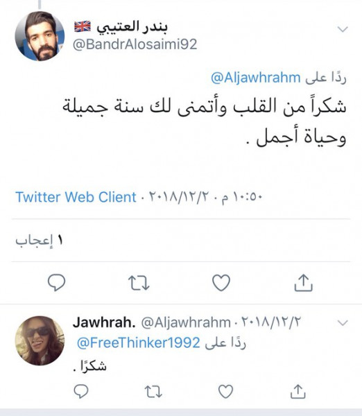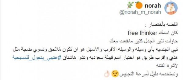 وقالت مغردة تدعى نوره: "القصه باختصار: كان اسمك free thinker حاولت تثير الجدل كثير مانفعت معك تبي الجنسيه بأي وسيله والوسيله الاقرب والاسهل هو ان تكون مُلاحق وتسوي ضجة مثل هذي واقرب طريق هو اختيار اسم قبيلة سعوديه ونشر هاشتاق #عتيبي_يتحول_للمسيحية لإثارة الفتنه وتستخدمه دليل لسرعة التجنيس".