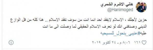 وقال مغرد يدعى "هاني الأشرم الشمري": "حزين لأجلك، الإسلام لايفقد احد انما انت من سوف تفقد الاسلام .. هذا كله من قل الوازع الديني وصدقني انك لو تعرف الاسلام الحقيقي لما وصلت الى ما انت عليه".