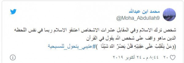 وقال مغرد يدعى محمد بن عبدالله: "شخص ترك الاسلام وفي المقابل عشرات الاشخاص اعتنقو الاسلام ربما في نفس اللحظه الدين ماهو واقف على شخص الله يقول في القرأن (وَمَنْ يَنْقَلِبْ عَلَى عَقِبَيْهِ فَلَنْ يَضُرَّ اللَّهَ شَيْئًا)".