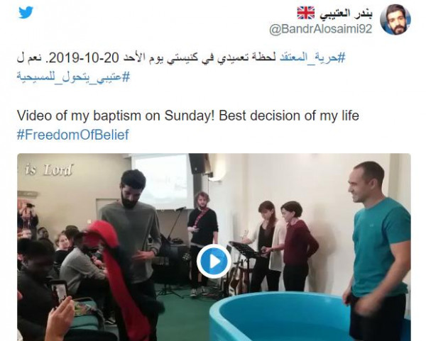 ويوم الخميس، نشر الشاب الذي يعرف نفسه على حسابه في تويتر بأنه "سعودي مسيحي" مقطع فيديو، أرفقه بتعليق: "لحظة تعميدي في كنيستي يوم الأحد 20-10-2019"، مذيلًا تغريدته بوسم "نعم ل #عتيبي_يتحول_للمسيحية".