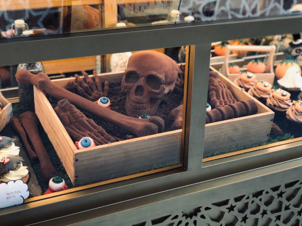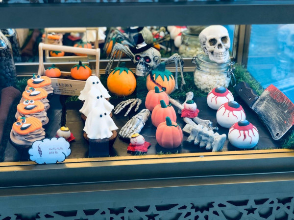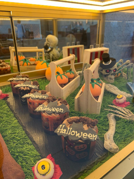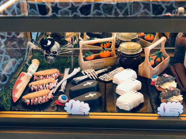 وتتضمن قائمة الطعام الخاصة بيوم الهالوين تشكيلة واسعة من الحلويات اللذيذة ذات التصميم المميز كفدج الشوكولاتة على شكل تابوت، وكعكة الفاكهة على شكل مومياء، وكوكيز حبيبات الشكولاتة، وكب كيك الفانيلا على شكل وطواط، وكب كيك الشكولاتة على شكل قرع، والبراونيز على شكل مقلة العين.
