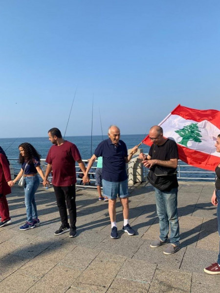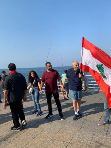 وتداول رواد مواقع التواصل الاجتماعي صورا يظهر فيها المصري أثناء تنظيم سلسلة بشرية بين شمال لبنان وجنوبه، ويحمل علم لبنان.