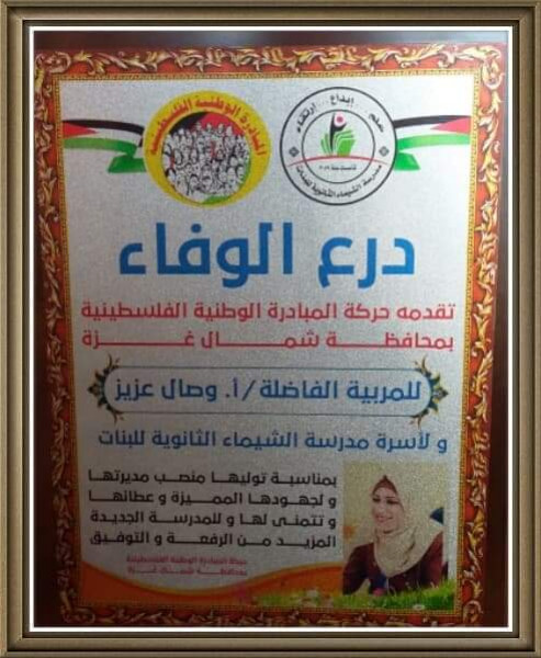 كرمت حركة المبادرة الوطنية الفلسطينية وقطاعها النسوي بمحافظة شمال غزة المربية الفاضلة أ. وصال عزيز لمجهوداتها الكبيرة في توفير الإمكانيات للطالبات اللاتي التحقن للدراسة في مدرسة الشيماء الثانوية للبنات والتي جرى تأسيسها هذا العام و افتتاحها في حفل جماهيري كبير بعد أن تولت منصب المديرة لها.