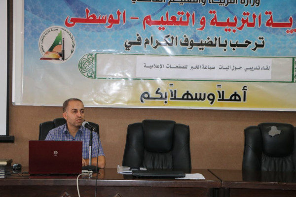 نظمت مديرية التربية والتعليم بالوسطى لقاءً تدريبياً حول آليات صياغة الخبر للصفحات الإعلامية لمنسقي الإعلام بالمدارس، حيث قام بالإشراف والتدريب رئيس قسم العلاقات العامة وعضو لجنة المبادرات الإبداعية بالوسطى أحمد دلول وبمشاركة منسقي الاعلام ومسؤولي الصفحات المدرسية، وذلك بقاعة الاجتماعات