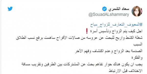 وقالت الأكاديمية والناشطة السعودية، سعاد الشمري، في تعليق على الجدل الدائر تحت وسم #المعيوف_التعارف_للزواج_مباح في موقع "تويتر": "اجل كيف يتم الزواج وتأسيس أسرة! شغلة اكشط واربح للبحث عن عروسه من صالات الأفراح ساهمت برفع نسب الطلاق، السبب الصدمة بعد الزواج وعدم اكتشاف وفهم الآخر والفكرة، يجب ان يكون هناك حوار تفاهم بحث عن المشتركات بين الطرفين وتقريب مسافة الاختلاف قبل الارتباط".