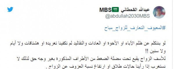 وكتب المدون السعودي عبدالله القحطاني في الاتجاه ذاته: "لو بنتكلم عن ظلم الآباء او الأخوة او العادات والتقاليد لم تكفينا تغريدة او هشتاقات ولا أيام ولا سنين !! للأسف الزواج يقبع تحت مظلة الضغط من الأطراف المذكورة بغير وجه حق لذلك لا نستغرب إذا رأينا حالات طلاق او ارتفاع نسبة العزوف عن الزواج".