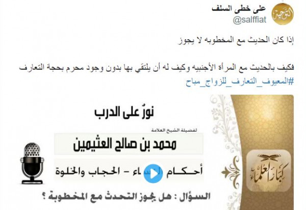 ورد مدون آخر معارض لإباحة التعارف، بنشر مقطع صوتي منسوب للداعية السعودي الراحل محمد العثيمين، يدعم فيه موقفه، وكتب معلقًا عليه: "إذا كان الحديث مع المخطوبة لا يجوز فكيف بالحديث مع المرأة الأجنبية وكيف له أن يلتقي بها من دون وجود محرم بحجة التعارف".