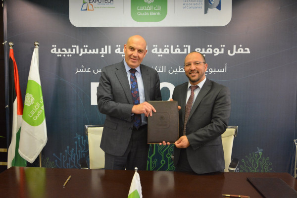 وقع بنك القدس إتفاقية رعاية مع اتحاد شركات أنظمة المعلومات الفلسطينية "بيتا" بحيث يكون بنك القدس الراعي الإستراتيجي لأسبوع فلسطين التكنولوجي السادس عشر "اكسبوتك 2019" والذي من المقرر أن يُعقد في رام الله يوم الخامس من شهر تشرين الثاني، تحت شعار" التكنولوجيا المالية".