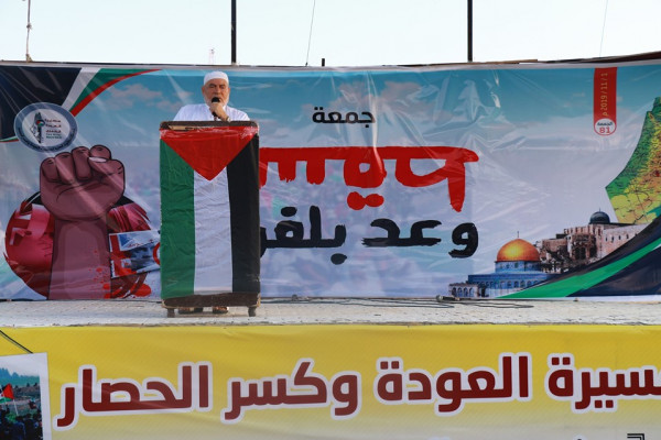 ولفت إلى أن مسيرات العودة والمقاومة من خلفها هي التي تعمل على حماية الثوابت الفلسطينية، وأفشلت مخططات أمريكا بما يسمى صفقة القرن، وشدد على أن مسيرات العودة مستمرة حتى تحقق جميع أهدافها بفك الحصار عن شعبنا، مثمنا الدور الكبير للمقاومة الفلسطينية التي حمت تلك المسيرات وشكلت درع واقي لها ورسمت استراتيجية الردع.