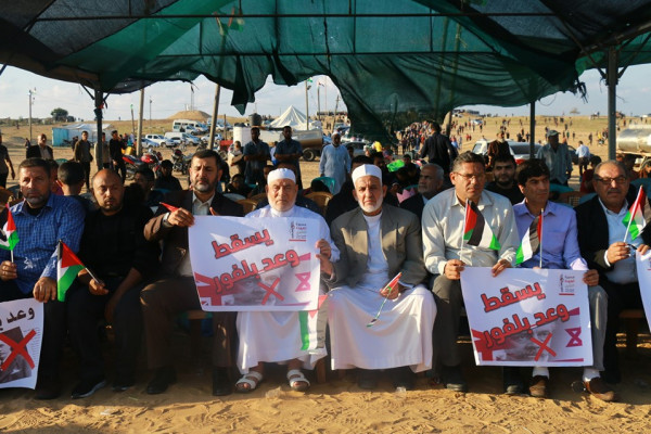 وقال خلال مشاركته في مسيرة العودة وفك الحصار شرق رفح: إن جريمة بريطانيا في وعد بلفور المشؤوم، واعتراف السلطة في رام الله بإسرائيل في اتفاق أوسلو، ومؤامرة ترامب والكيان الصهيوني في صفقة القرن، يشكل هذا الثالوث التآمري هدفاً خطيراً لتصفية قضيتنا الوطنية دون أي اعتبار لقيم الحرية والعدالة ومبادئ حقوق الإنسان وكل الاتفاقيات والمواثيق الدولية.