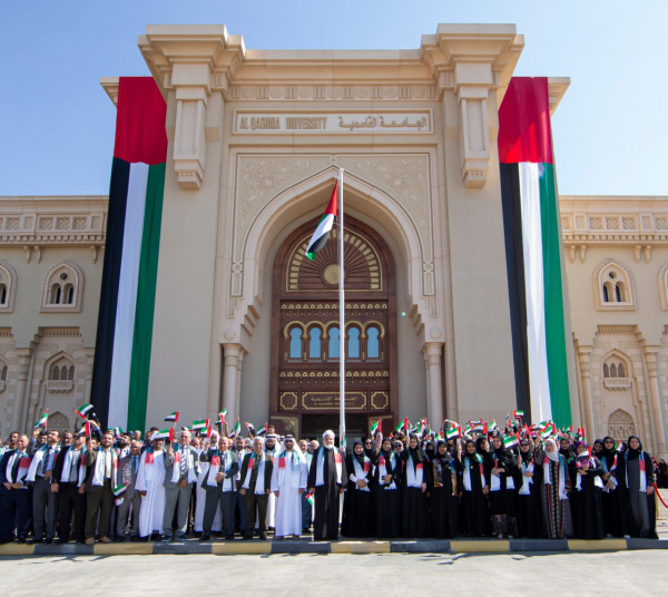وجرى رفع العلم من أمام مقر الجامعة القاسمية بالشارقة في حضور مدير الجامعة والهيئة التدريسية والادارية والطلبة لرفع العلم من ساريه الجامعة حيث شهد الحفل أساتذة الجامعة وطلبة الجامعة الذي ينحدرون من أكثر من 60 دولة في العالم .