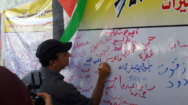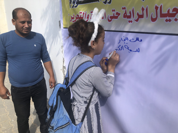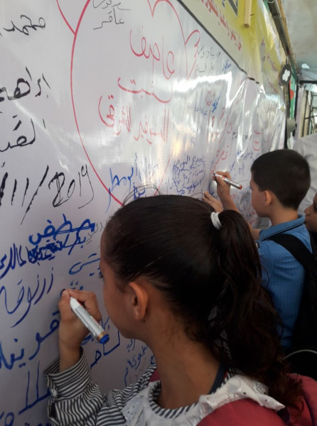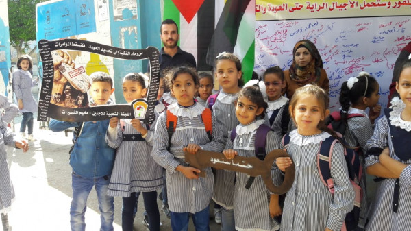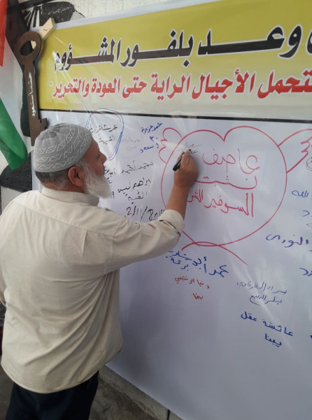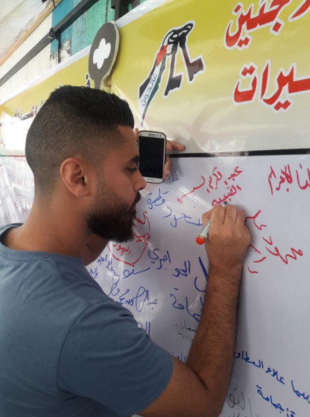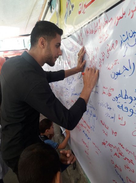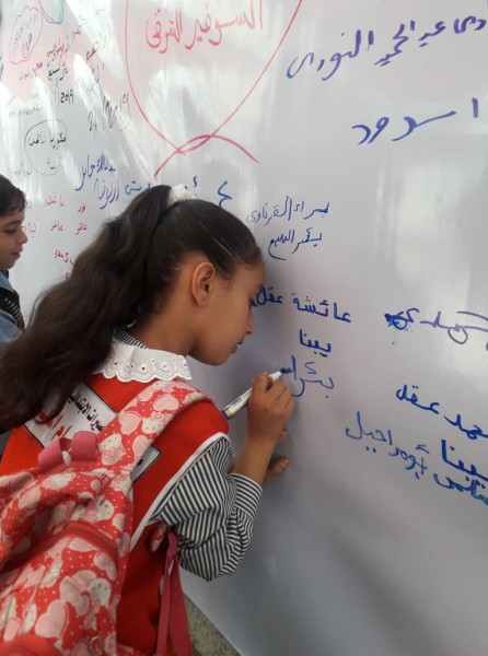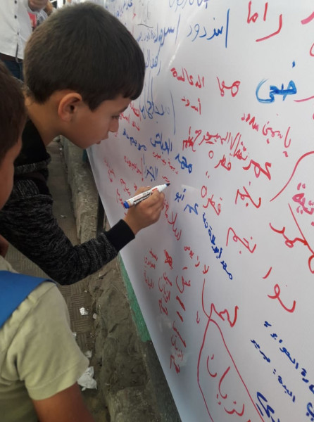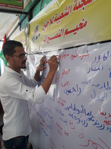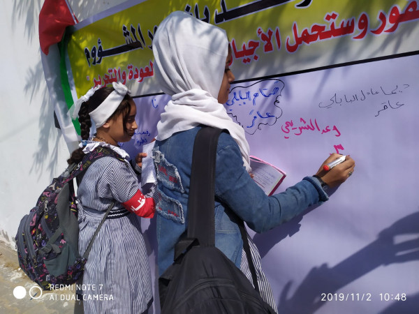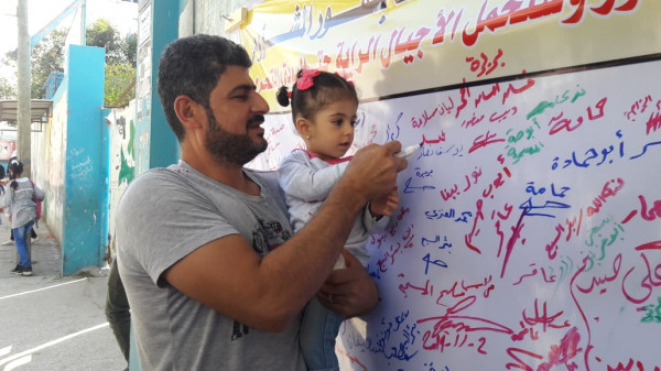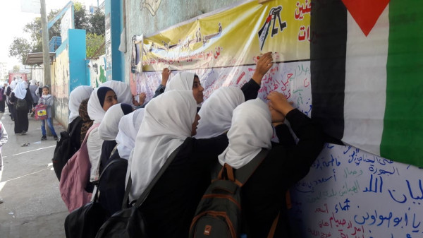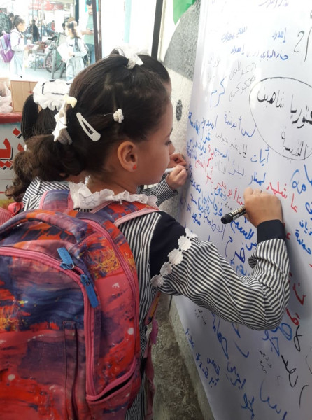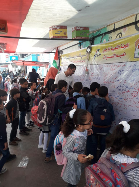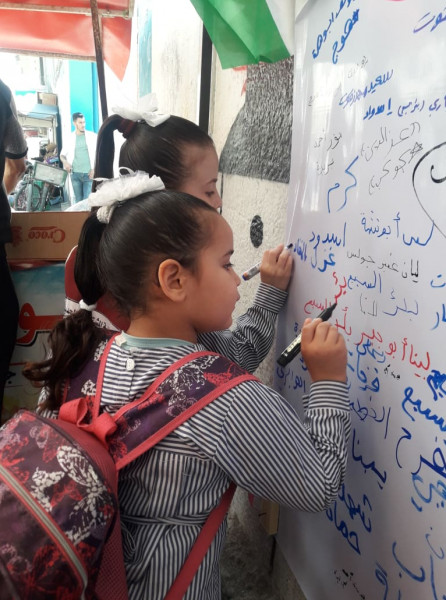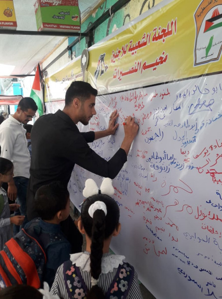 واختارت اللجنة تنفيذ الفعاليات والصاق جداريات التوقيع على مدارس (أونروا) للتأكيد على أهمية هذه المؤسسة الدولية الشاهدة على اللجوء الفلسطيني وحق شعبنا في تقرير مصيره ودعماً للأنروا وتجديد التفويض لها.