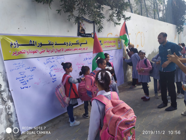 أحيت اللجنة الشعبية للاجئين في مخيم النصيرات الذكرى الـ 102 لوعد بلفور المشؤوم، الذي يصادف الثاني من نوفمبر، وشملت فعاليات عديدة " توقيع جدارية بالقرى والبلدات الفلسطينية، توزيع نشرة خاصة حول وعد بلفور، وإجراء مسابقة