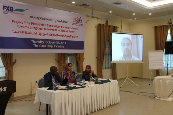 حيث افتتح الحفل أ. عمر شعبان مدير مؤسسة بال ثينك شاكراً مؤسسة FXB وجميع المؤسسات الشريكة التي عملت على تنفيذ المبادرات خلال فترة المشروع وساهمت في نشر ثقافة اللاعنف.