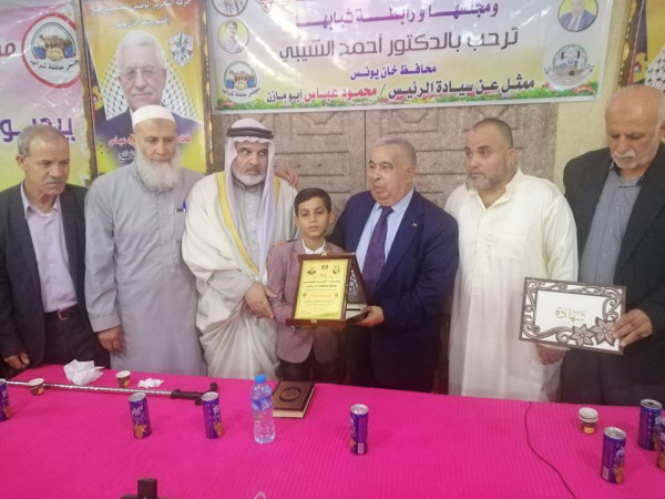 كرم الدكتور احمد الشيبي محافظ خانيونس الطفل محمود عباس شراب لإتمامه وحفظة القران الكريم في عامين وذلك خلال احتفالا بديوان عائلة شراب حضره أعيان ووجهاء ومخاتير العائلات وأبناء العائلة وأعضاء الأقاليم لحركة فتح وأعضاء من