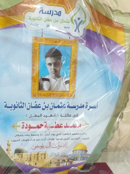 أقامت مدرسة عثمان بن عفان حفلاً تأبينياً للطالب الشهيد محمد عطية حمودة من الصف الثاني عشر أدبي، والذي ارتقى خلال العدوان الإسرائيلي الأخير على قطاع غزة، وشارك في التأبين مدير التربية والتعليم في شمال غزة أ. نبيل العرابيد، ومدير الدائرة الإدارية أ. جواد صالحة، ومدير الدائرة الفنية أ. موسى شهاب، وعدد من رؤساء الأقسام والعاملين بالمديرية، و من عائلة الشهيد مختار العائلة السيد وهيب جمال حمودة، ووالد الشهيد السيد عطية مصلح حمودة وعدد من أعمام وأقارب وجيران الشهيد.