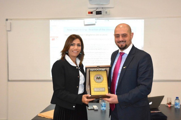 من جهته قدم ممثل جمهورية قبرص ساڤاس فلاديميرو عرضا عن قبرص، وتطرق لمجريات العملية السلمية ومراحل تقدمها من غيرها، وتحدث عن العلاقات الثلاثية بين الدول وحقول الغاز في منطقة المتوسط، مشيرا الى ضرورة العمل دبلوماسياً وبشراكات لخدمة مصالح دول المنطقة، داعيا دولة فلسطين الى الاستمرار بتفعيل دورها الدبلوماسي للحصول على الحقوق الفلسطينية في منطقة اقتصادية مخصصة حسب قوانين البحار الدولية.