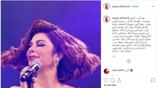 وقالت أصالة في تعليقها على الصورة: "هنا أحيا … أشعر بوجودي، بأهميّة ماأملك… يصبح لكياني معنى، وهنا أكون معزوفة أفضفض وأُعبّر وأشكو وأضحك وأرى حتى الهموم تحنو عليّ، يدقّ قلبي وتتسارع دقّاته، وتتفتّح في حنجرتي ورودًا أراها، وتتراقص الدّنيا ألمًا وزهوًا".