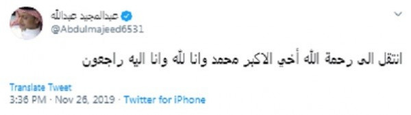 فجع الفنان السعودى عبد المجيد عبد الله بوفاة شقيقه الأكبر، واعلن هذا الخبر الحزين على حسابه الخاص على موقع تويتر.