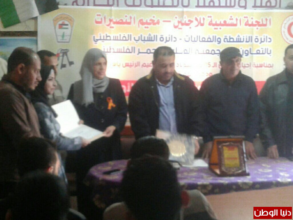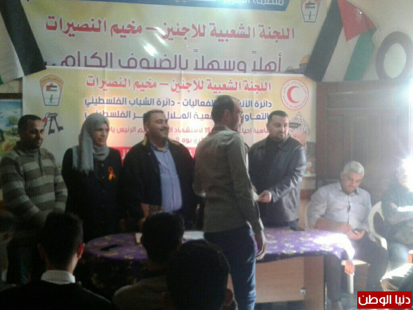 احتفلت اللجنة الشعبية للاجئين بمخيم النصيرات ، وسط قطاع غزة، بتخريج دورة الإسعافات الأولية مساء اليوم بمقرها ، والتي نظمتها دائرتي الأنشطة و الفعاليات، و الشباب الفلسطيني بالتعاون مع جمعية الهلال الأحمر الفلسطيني، وذلك بمناسبة الذكرى الخامسة عشرة لاستشهاد الرئيس ياسر عرفات، و ذكرى الاستقلال.
