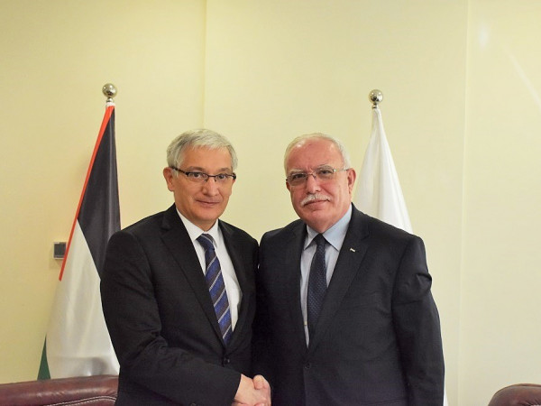 استقبل وزير الخارجية والمغتربين د. رياض المالكي، في مقر الوزارة بمدينة رام الله، القائم بأعمال القنصلية التركية الجديد المعتمد لدى دولة فلسطين السيد Ahmet Riza Demirer، والوفد المرافق له.