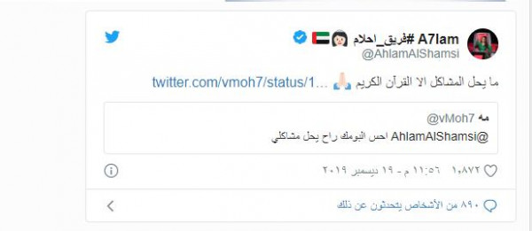 ردت الفنانة الإمارتية أحلام على أحد متابعيها بطريقة حازمة وذلك عبر حسابها على”تويتر” حيث كتب أحد المتابعين تعليقًا على ألبومها قائلًا: "أحس ألبومك راح يحل مشاكلي"، لترد عليه كاتبة: “ما يحل المشاكل إلا القرآن الكريم".