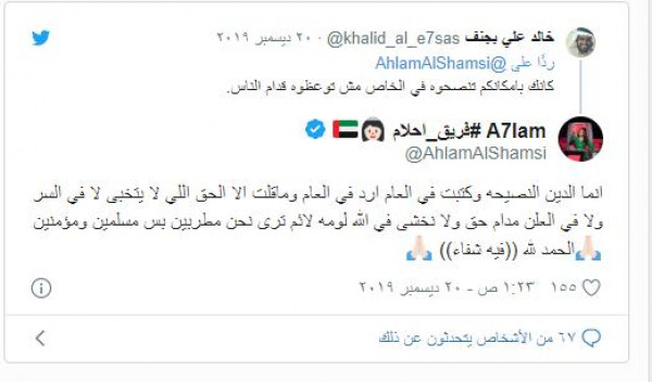 وعلق متابع آخر: “كان بإمكانكم أن تنصحوه على الخاص وليس قدام الناس” لترد أحلام قائلة: "إنما الدين النصيحة، وكتبت في العام أرد في العام، وما قلت إلا الحق اللي لا يتخبى في السر ولا في العلن ما دام حق.. ولا نخشى في الله لومة لائم، ترى نحن مطربين بس مسلمين ومؤمنين.. الحمد لله فيه شفاء" بحسب "نورت".