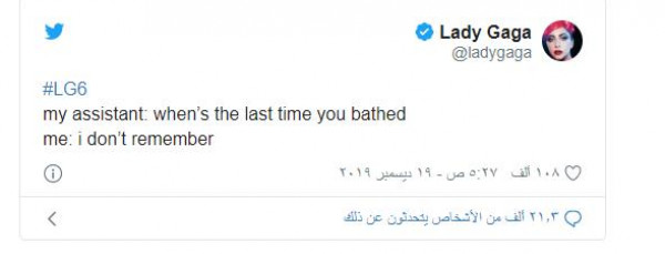 وكشفت "غاغا"، في تغريدتها الأربعاء الماضي، أنها لا تستطيع أن تتذكرآخر مرة استحمت فيها.