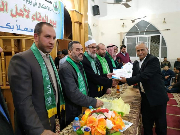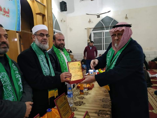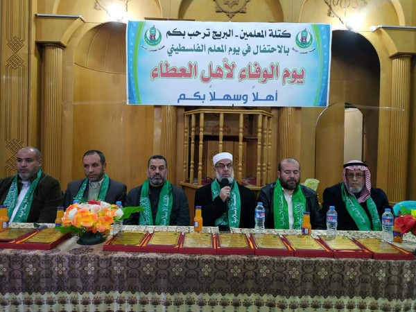 كرم النائب عن كتلة التغيير والإصلاح البرلمانية في المحافظة الوسطى الدكتور عبد الرحمن الجمل معلمي المحافظة الوسطى خلال حفل نظمته كتلة المعلمين في مخيم البريج بعنوان يوم الوفاء لأهل العطاء، بحضور الاستاذ محمود عيسى رئيس بلدية البريج والاستاذ حسن المقادمة رئيس إدارية الوسطى والاستاذ خالد الشريف القيادي في حركة حماس ولفيف من الكوادر التعليمية والمعلمين .