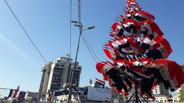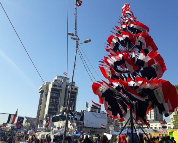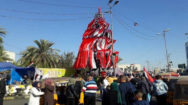 نصب متظاهرو ساحة التحرير وسط بغداد، شجرة ميلاد ضخمة زينوها بأعلام العراق تزامنا مع حلول أعياد الميلاد ورأس السنة.