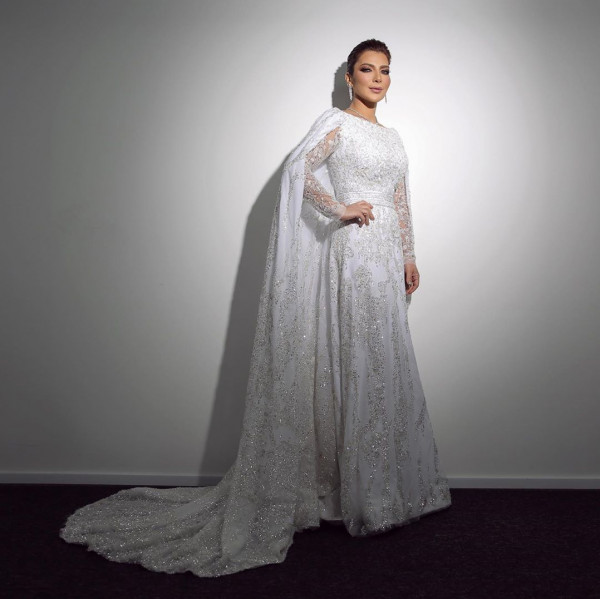وارتدت أصالة فستان أبيض طويل ذا أكمام طويلة وقد حمل الفستان توقيع مصمم الأزياء nicolasjebran، واتسم التصميم بالتطريزات اللامعة التى زادت من فخامة التصميم.