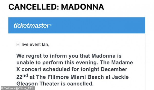 وغضب المشجعون عندما ألغت ملكة البوب أداء جولة مدام إكس قبل ساعتين فقط من موعد العرض.