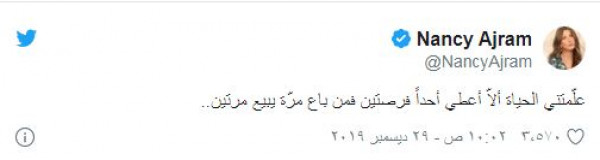 وكتبت نانسي: "علّمتني الحياة ألاّ أعطي أحداً فرصتين فمن باع مرّة يبيع مرتين".