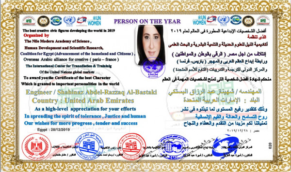 حصدت الكاتبة الأماراتية شهناز عبد الرزاق البستكي على لقب أفضل شخصية إنسانية مؤثرة للعام من ضمن 100 الشخصيات والإبداعية المطورة لعام 2019 على مستوى الوطن العربي جاء الاختيار من أكاديمية النيل للعلوم والتنمية البشرية والبحث العلمي وائتلاف من أجل مصر ورابطة إبداع العلم العربي والمهجر بباريس.