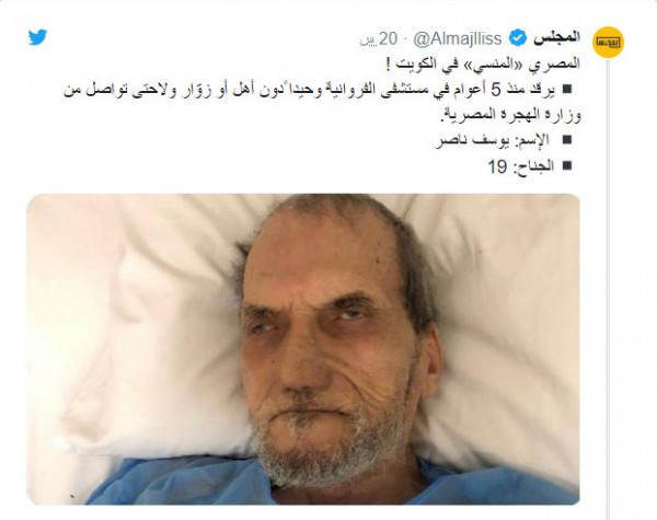 وقال الحساب الإخباري، الذي نشر صورة المسن المصري ويدعى يوسف ناصر، إن المصري يرقد في مستشفى الفروانية منذ 5 أعوام وحيدا، دون أهل أو زوار أو حتى تواصل من وزارة الهجرة المصرية.