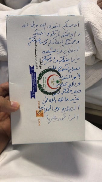 وأضاف في حديث لصحيفة (سبق) المحلية: "في أثناء تنويم والدي اخذ مني قلمي وفي تصرف عفوي، تناول علبة منديل وقام بكتابة وصيته عليها"، لافتاً إلى أنه التقط مقطع الفيديو لوالده أثناء كتابته الوصية، صباح أمس الأحد، وأرسله لقروب العائلة المكونة من ستة أولاد وبنت، مؤكداً أنه لم يتوقع انتشار الفيديو بهذا الحجم.