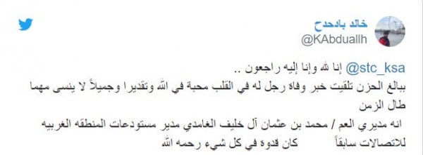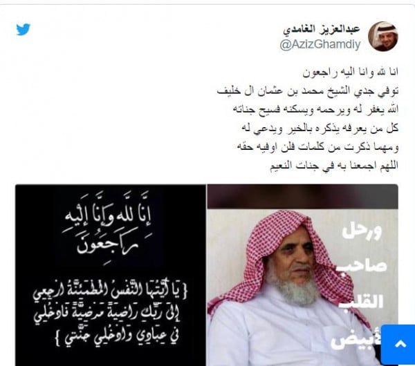 وقال ابنه مشرف بن محمد بن خليف الغامدي: إن "والده كان مدير مستودعات الاتصالات في المنطقة الغربية لفترة طويلة، وإنه أصيب بجلطة خفيفة في الدماغ، مساء أمس الأول السبت، وتم تنويمه بمستشفى الملك فهد في جدة.