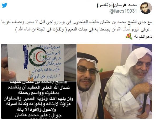 وتابع: "لاحظت والدي يكتب وصيته بسرعة، وأنه شعر بصداع شديد، وأن لحظة الحق قريبة جداً منه، وتوفي والدي ظهر أمس الأحد، وصلينا عليه في جامع الفيصلية ودفن في مقبرة الفيصلية في مدينة جدة".