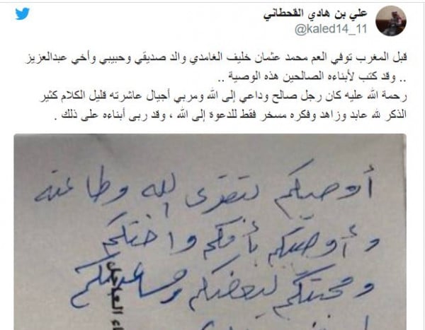 كتب الغامدي وهو موظف حكومي متقاعد من قرية المكارمة بمحافظة بلجرشي، وصيته في صباح يوم أول أمس الأحد، وتوفي ظهر اليوم ذاته، ليدفن في مقبرة الفيصلية في المدينة الساحلية دون أن تنتهي قصته عند هذا الحد.